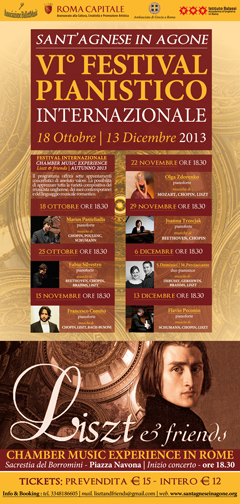 Festival Festival Internazionale Pianistico Liszt & friends - VIa edizione Nato in occasione del 200° anniversario della nascita di Franz Liszt (2011) è giunto oggi alla sua Sesta Edizione con il nome di “Festival Internazionale Pianistico Liszt & friends”, ospitando negli anni musicisti di indiscutibile talento provenienti da tutto il panorama pianistico mondiale. In linea con il progetto è il sostegno dei giovani musicisti e talenti emergenti che il Festival alterna alla presenza di musicisti già affermati e riconosciuti del panorama cameristico e concertistico internazionale; gettando così uno sguardo al futuro del pianismo e del concertismo mondiale. In questo senso proprio in occasione del 200° anniversario della nascita di Franz Liszt il festival ha ospitato in collaborazione con l'Accademia d'Ungheria di Roma, l'Ambasciata della Repubblica Federale a Roma, la Casa di Goethe e l’Istituto Storico Germanico di Roma, la “Notte Lisztiana Europea” tourneè mondiale dei vincitori dei Concorsi Pianistici Internazionali di Weimar, Utrecht e Budapest, considerati tra i più importanti ed autorevoli dedicati alla musica di Liszt: Gabor Farkas, Alexander Ullman e Masataka Goto. Così come il vincitore del 62° Concorso Pianistico Internazionale “G. Viotti” di Vercelli Alexey Lebedev. Grazie all’accurata direzione artistica e alla professionalità ed esperienza l'Associazione Ballettmusic vuole con questa proposta culturale continuare nella sua opera di diffusione e sensibilizzazione all’ascolto della musica da camera promuovendo il prestigioso patrimonio artistico della Chiesa di Sant'Agnese in Agone di Piazza Navona. Il programma offrirà al pubblico sette appuntamenti concertistici di assoluto valore con la possibilità di apprezzare tutta la varietà compositiva dei lavori del musicista ungherese, dei suoi contemporanei e del linguaggio musicale romantico. Nella suggestiva cornice di Piazza Navona, tra le affascinanti architetture del Borromini. Sant'Agnese in Agone è uno dei più preziosi gioielli del barocco che sicuramente catalizzerà l'attenzione del pubblico internazionale, sempre presente in tutte le edizioni della rassegna, per un'esperienza unica all'insegna dell'arte e della musica. In una delle più belle sale da concerto di Roma - la Sagrestia del Borromini di Sant'Agnese in Agone – un viaggio alla riscoperta della bellezza delle architetture barocche accompagnato dalle emozioni che solo musica sa evocare. Con il patrocinio di ROMA CAPITALE - Assessorato alla Cultura, Creatività e Promozione Artistica ed il sostegno dell'Accademia di Ungheria di Roma dal 18 OTTOBRE al 13 DICEMBRE 2013. PROGRAMMA: 18 Ottobre – Marios Panteliadis – Chopin, Poulenc, Schumann 25 Ottobre – Fabio Silvestro – Beethoven, Chopin, Brahms, Liszt 15 Novembre – Francesco Comito – Chopin, Liszt, Bach-Busoni 22 Novembre – Olga Zdorenko – Mozart, Chopin, Liszt 29 Novembre – Joanna Trzecjak – Beethoven, Chopin 6 Dicembre - Sara Dominici | Massimo Perciaccante - Debussy, Gershwin, Brahms, Liszt 13 Dicembre – Flavio Peconio – Schumann, Chopin, Liszt. Ingresso 12 Euro 18 ottobre 2013 - 13 dicembre 2013 Sacrestia del Borromini di S. Agnese in Agone a Piazza Navona, Roma |