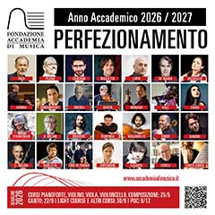 Pianoforte - Corsi di perfezionamento 26/27 della Fondazione Accademia di Musica Termine di iscrizione: 25 maggio 2026 Informazioni aggiuntive: Possono presentare la loro candidatura studenti fino ai 30 anni di età, già in possesso del diploma vecchio ordinamento, I livello o II livello o titoli equivalenti all’estero. La commissione si riserva di accettare studenti, per casi di particolare talento, anche se non in possesso dei requisiti sopra indicati. Docenti: Enrico Pace, Roberto Plano, Gabriele Carcano, Giovanni Doria Miglietta |