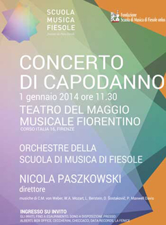 Nicola Paszkowski sarà alla testa dei complessi fiesolani –l'Orchestra dei Ragazzi, la Galilei e la Giovanile– impegnati in un programma vario e brillante, con musiche di Weber, Mozart, Bernstein, Shostakovich e Maxwell Davies. L'appuntamento col Concerto di Capodanno, da tempo una tradizione festosa e seguitissima, è solitamente preceduto dalla febbrile ricerca dei cartoncini d'invito: quest'anno saranno disponibili a partire da mercoledì 11 dicembre presso Alberti, Box Office, Ceccherini, Checcacci, Data Records, La Fenice. Affrettatevi! Solo per i soci dell'Associazione Amici della Scuola di Musica di Fiesole gli inviti saranno a disposizione presso la portineria della Scuola. Informazioni: Ingresso ad invito