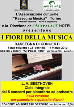 Rassegne I Fiori della Musica 2012 Rassegna dedicata al repertorio per archi e pianoforte con un programma riservato all'esecuzione del ciclo integrale dei cinque concerti per pianoforte ed orchestra di L. van Beethoven, nella versione per pianoforte e quintetto d'archi. Direzione artistica: Paolo Campanini. Interpreti: Eliana Grasso, Maria Kasznia, Simone Ferrero, Cecilia Novarino (pianoforte) - Roberta Bua, Gabriele Mele (violino) - Angelo Conversa (viola) - Luca Magariello, Eduardo Dell'Oglio, (violoncello) - Umberto Salvetti (contrabbasso). Concerti a ingresso gratuito, con inizio alle ore ore 16.30 22 gennaio 2012 - 11 marzo 2012 Sala dei Concerti dell'Air Palace Hotel, Torino - TO - Italia |