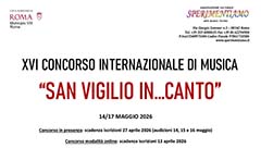 San Vigilio In...Canto XVI Concorso Internazionale di Musica Limite di età: secondo la categoria di appartenenza Termine di iscrizione: 27 aprile 2026 Informazioni aggiuntive: Il Concorso si propone di stimolare l’interesse, la pratica e la diffusione della musica tra i giovani, contribuendo a favorire – attraverso questo appuntamento annuale – la diffusione e lo scambio delle esperienze musicali maturate all’interno di realtà scolastiche, accademiche e associative. Non indifferenti al periodo storico che stiamo vivendo, e anche alle nuove sensibilità che ne scaturiscono, l'Associazione ha realizzato un Bando di concorso che permetta una partecipazione ampia e stimolante, continuando a garantire serietà e professionalità. I giovani talenti potranno continuare così a mettersi alla prova, a crescere musicalmente e umanamente grazie ad un sano confronto superando così il semplice concetto di “gara”. La “festa della musica” prevede le audizioni in presenza per tutte le sezioni e categorie. Le audizioni in presenza si svolgeranno presso la Sala Sisto V (via del Serafico, 1 Roma) nei giorni 14, 15 e 16 maggio 2026. È tuttavia possibile partecipare in modalità online con graduatoria differenziata rispetto alla modalità in presenza per tutte le sezioni e categorie previste dal concorso. La Cerimonia di premiazione di tutte le categorie si svolgerà domenica 17 maggio 2026 a partire dalle ore 15:30 presso l’Auditorium del Seraphicum (via del Serafico, 1 Roma) con il patrocino di Roma Capitale – Municipio VIII e sarà trasmessa in diretta streaming. Tutti i dettagli nel bando allegato, le registrazione sul sito dell'Associazione QUI |