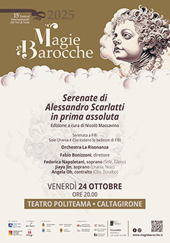 Venerdì 24 ottobre 2025, ore 20.00 - Serenate di Alessandro Scarlatti in prima assoluta. Serenata a Filli, Sole Urania e Clio lodano le bellezze di Filli. Edizione a cura di Nicolò Maccavino, Orchestra La Risonanza, Fabio Bonizzoni, direttore.